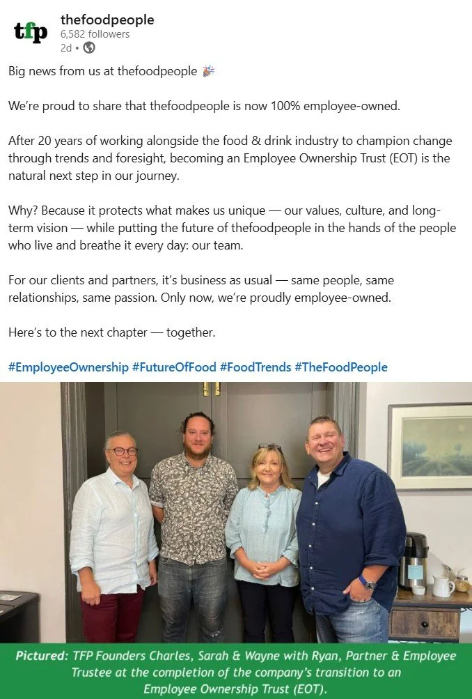 The Food People EOT September 2025 The Food People provide trend and insight data relating to the food and drink industry.They completed their switch to Employee Ownership in September 2025.